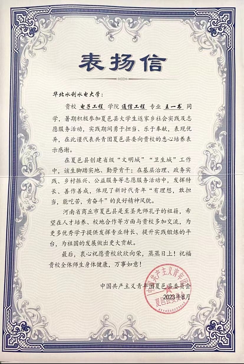 近日,电子工程学院收到了共青团夏邑县委的一封表扬信。信中表示,电子工程学院通信工程专业王一书同学,在暑期参加夏邑县大学生返家乡社会实践及志愿服务活动期间,勇于担当、乐于奉献、表现优异。该生在夏邑县创建省级“文明城”“卫生城”工作中,脚踏实地、勤劳肯干;在基层治理、政务实践、乡村振兴、公益服务等志愿服务活动中,发挥特长、善作善成,体现了新时代青年“有理想,敢担当,能吃苦,肯奋斗”的良好精神风貌。