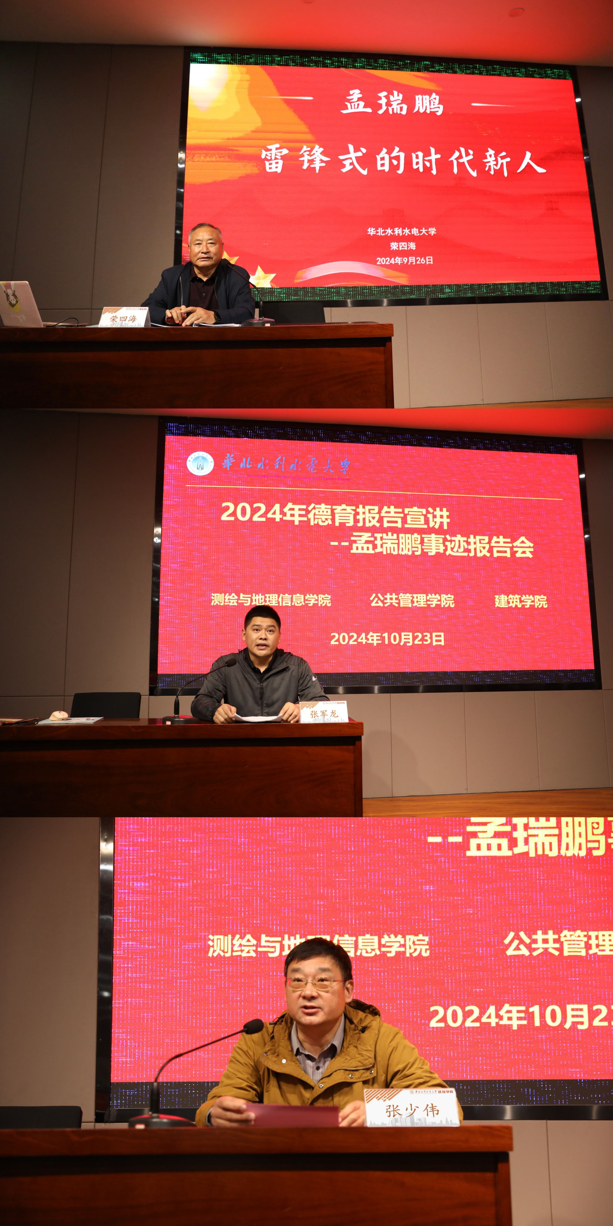 2024年10月23日上午,由华北水利水电大学建筑学院、公共管理学院和测绘与地理信息学院联合举办,国际教育学院(乌拉尔学院)关工委协助的孟瑞鹏事迹德育报告宣讲活动在建筑学院9116报告厅举行。此次活动旨在贯彻落实党的二十届三中全会精神和教育部党组34号文件要求,发挥“五老”精神的引领作用,引导青年坚定理想信念,传承红色基因,成为新时代有担当的青年。活动特邀校关工委副主任荣四海教授以及国际教育学院(乌拉尔学院)团委书记张军龙老师作为宣讲人,公共管理学院党委副书记连俊彩、测绘与地理信息学院党委副书记王怡青、建筑学院党委副书记刘静霞及150余名学生参加了此次宣讲。宣讲活动由建筑学院党委书记张少伟主持。
