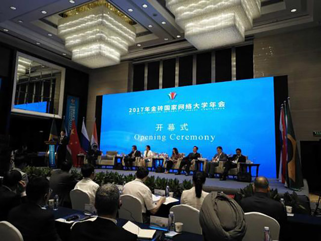 7月2日,2017年金砖国家网络大学年会在郑州开幕。来自中国、俄罗斯、印度、巴西、南非“金砖五国”的教育部官员,金砖国家网络大学22所成员高校以及其它高校的校领导和专家学者代表200余人,共商高等教育合作、交流、发展大计。