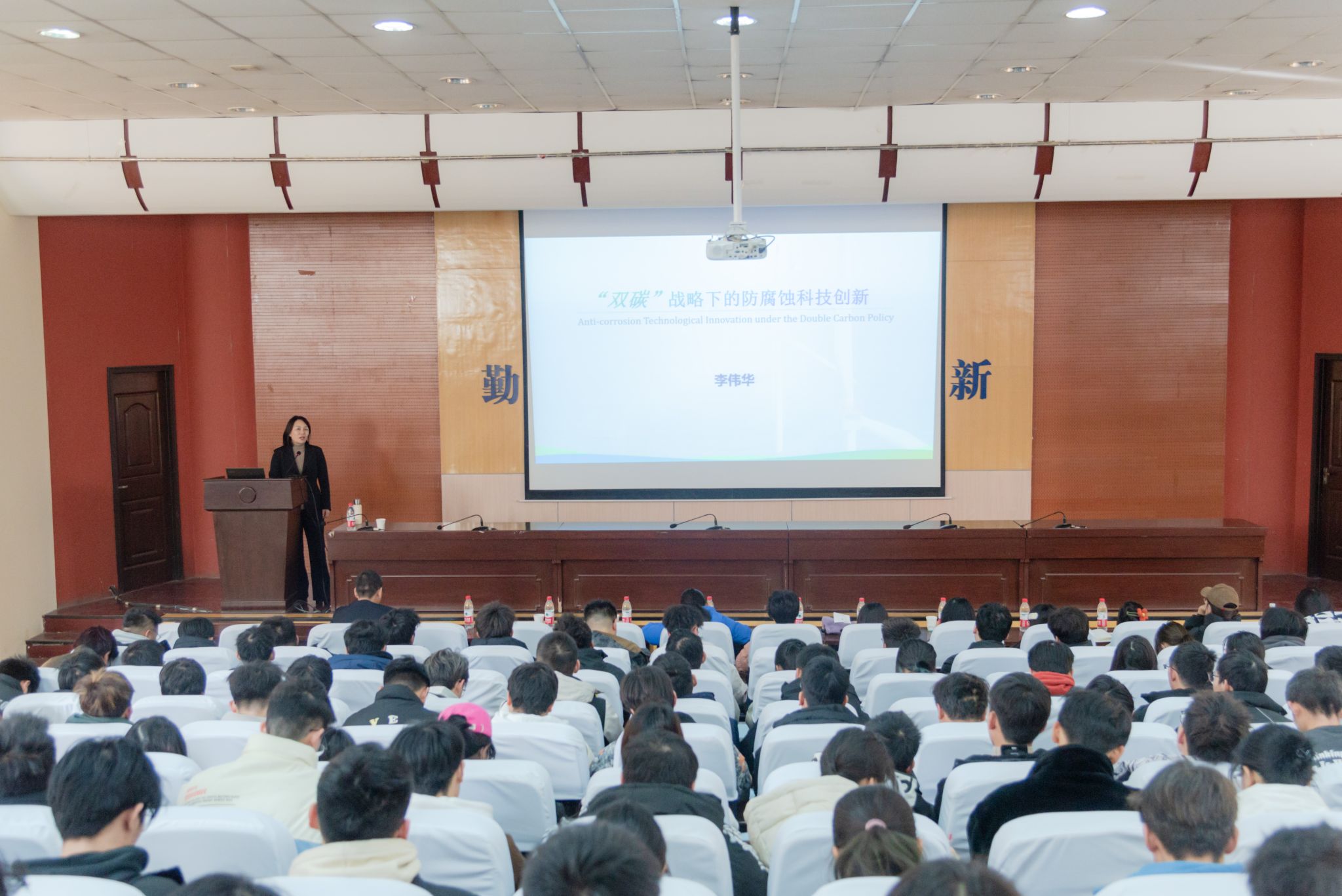 李伟华教授结合自身科研经历,与同学们分享了作为一名科研工作者的初心与使命。随后,她以“双碳战略下的防腐蚀科技创新”为主题,立足我国“双碳战略” “海洋强国”等国家战略部署,以实际防腐蚀工程技术难题为牵引,结合自己30多年在腐蚀防控方面的研究经历和丰硕的创新性研究成果,介绍了材料腐蚀劣化对工程结构耐久性的损害,以及先进功能性防护材料的应用等内容。她激励同学们要树立远大的理想与目标,坚持四个面向,培养学术志趣,只有将个人理想与家国情怀相结合,才能在遇到挫折时始终保持锲而不舍的奋进精神,争做具有学习力、思辨力、创新力的新时代大学生。