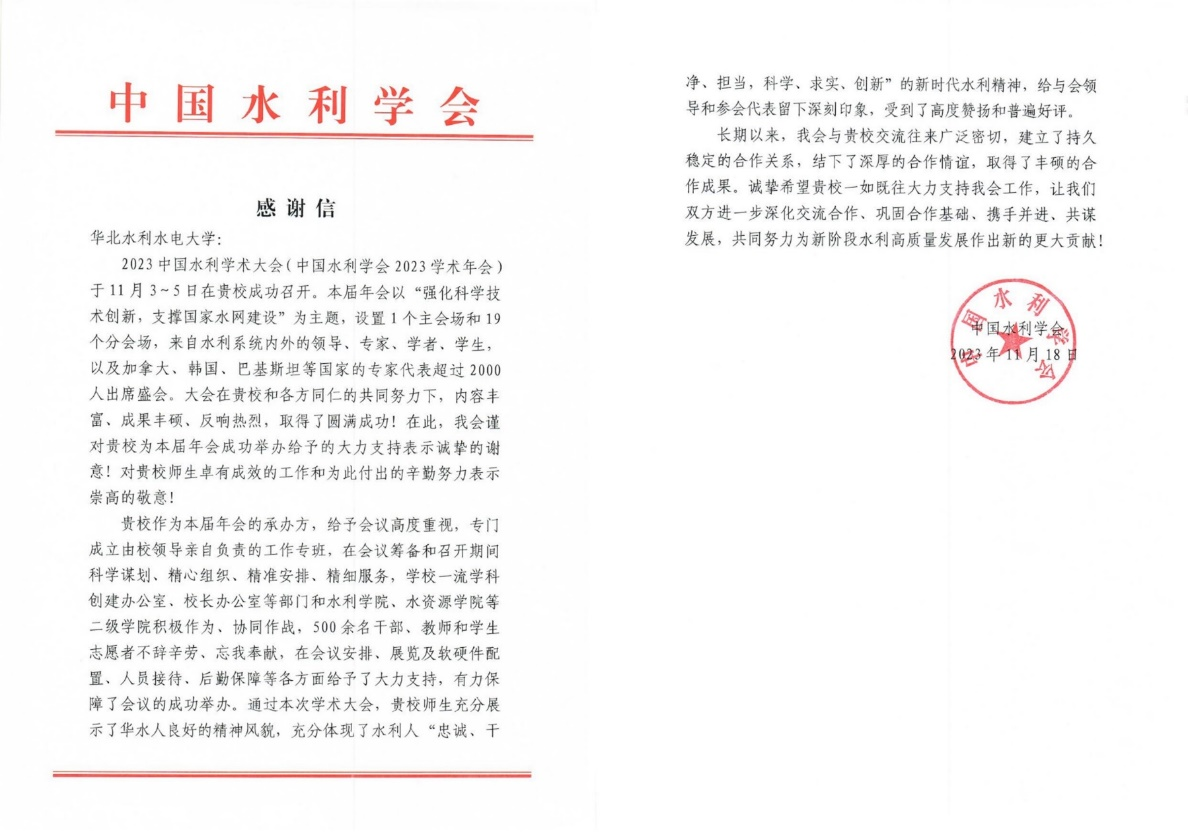 近日,我校收到来自中国水利学会的感谢信,对我校为2023中国水利学术大会(中国水利学会2023学术年会)成功举办给予的大力支持、我校师生卓有成效的工作和为此付出的辛勤努力表示感谢。