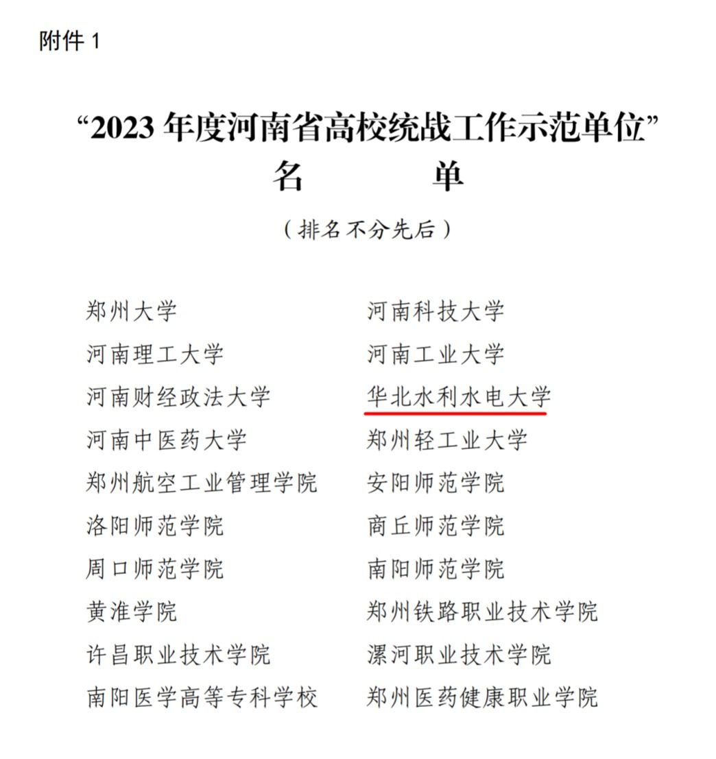 近日,中共河南省委教育工委、河南省教育厅下发《关于2023年度河南省高校统战工作有关评选活动结果的通知》(豫教工委〔2024〕25号),我校被授予“2023年度河南省高校统战工作示范单位”称号。这是我校自2017年获得首批河南省高校统战工作示范单位以来,第六次获此殊荣。