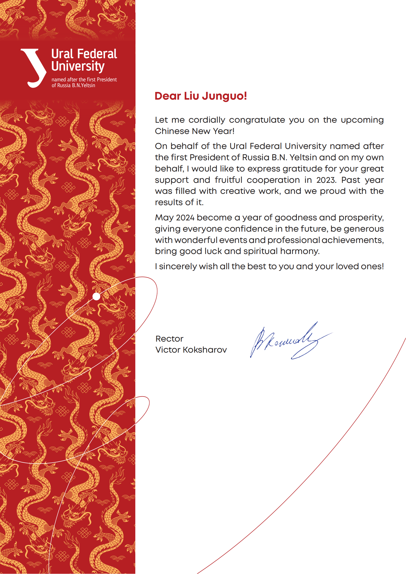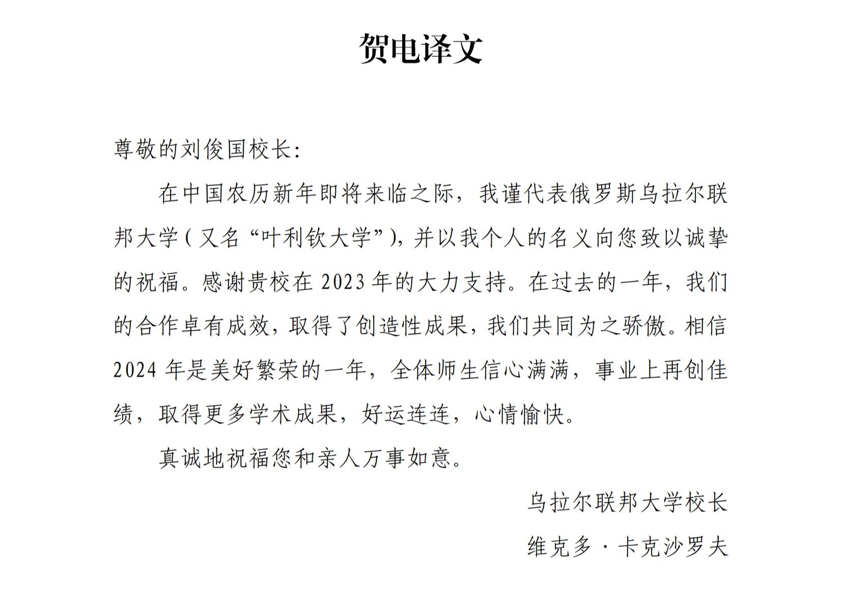 在新春佳节来临之际,俄罗斯乌拉尔联邦大学校长维克多·阿纳托利耶维奇·卡克沙罗夫向我校刘俊国校长发来贺电,代表俄罗斯乌拉尔联邦大学,并以他个人的名义向全校师生致以新春祝福。