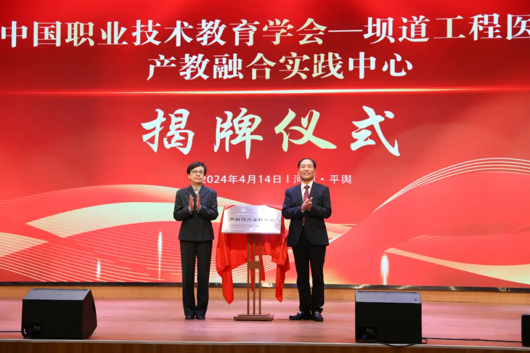 王复明院士和鲁昕会长共同为“中国职业技术教育学会—坝道工程医院”产教融合实践中心揭牌。