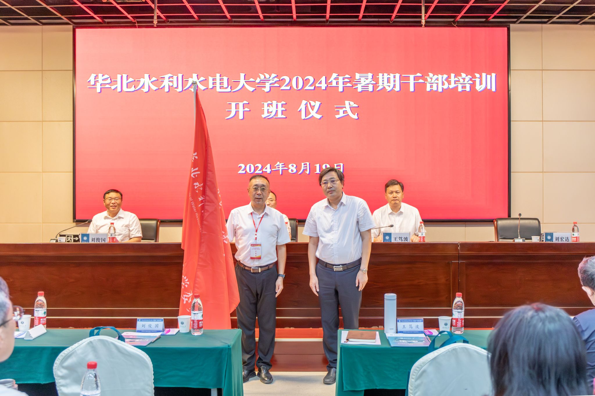 8月19日下午,我校2024年暑期干部培训班开班仪式在华中师范大学培训中心报告厅举行。华中师范大学党委书记夏立新、我校党委书记王笃波出席并致辞,我校党委副书记、校长刘俊国主持开班仪式,华中师范大学副校长刘宏达为培训班授班旗,我校校领导及全体正处级(主持工作的副处级)干部参加开班仪式。