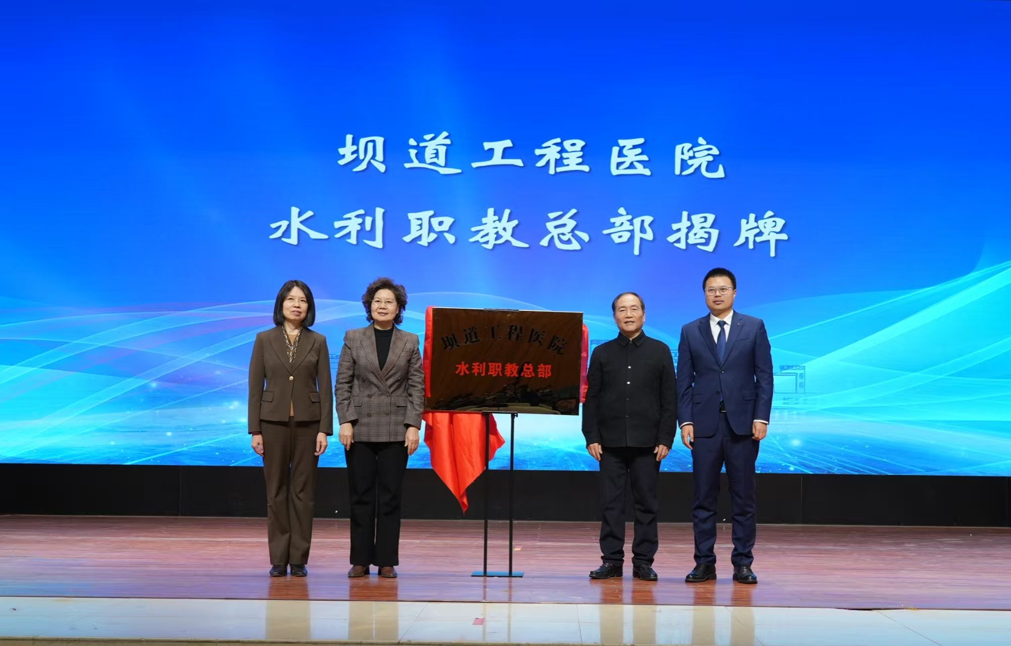 在与会领导、专家学者的共同见证下,王复明、周保平、焦爱萍、胡昊为坝道工程医院水利职教总部揭牌。