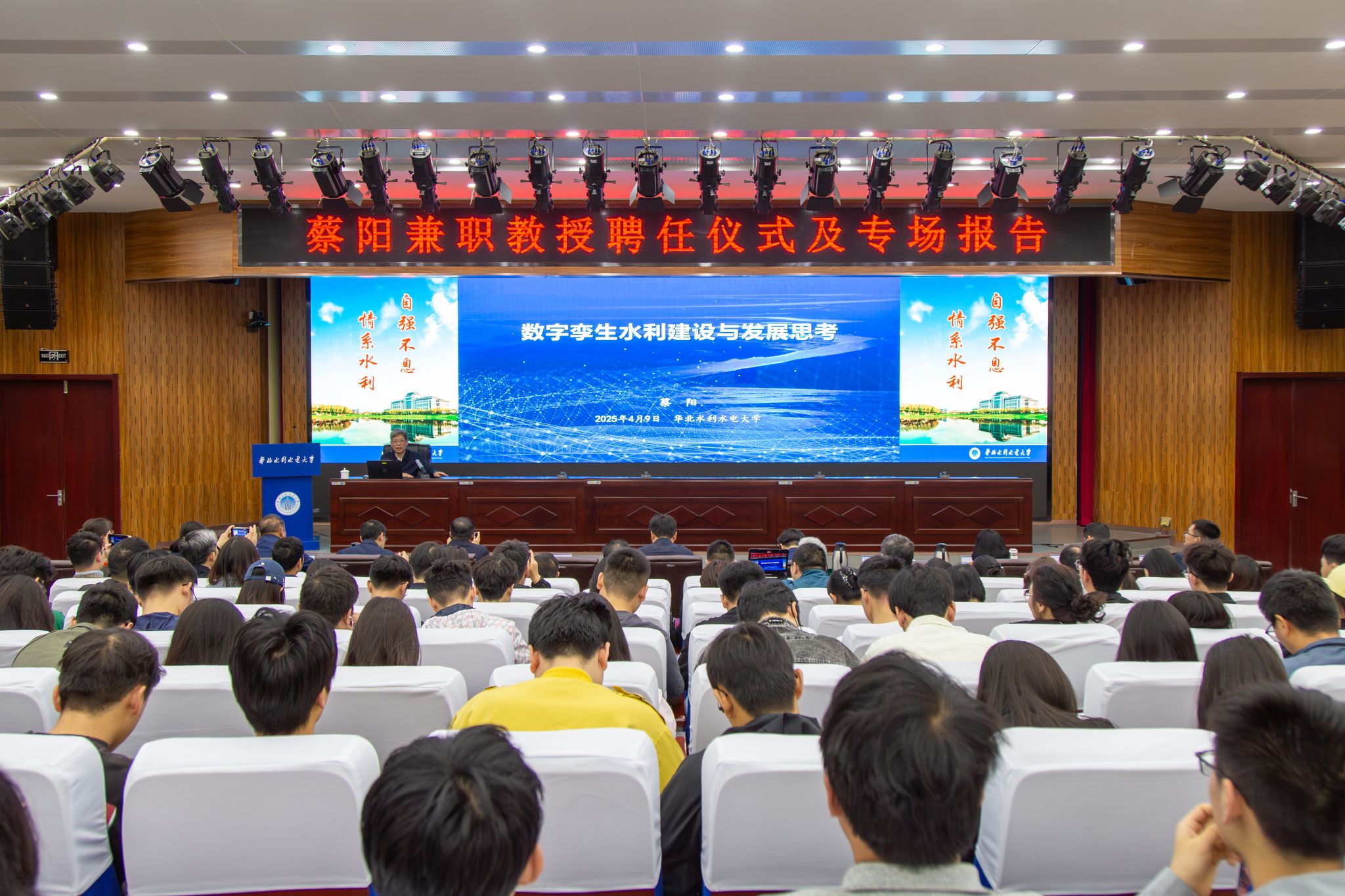 聘任仪式后,蔡阳教授作了《数字孪生水利建设与发展思考》专场报告,从“是什么”“为什么”“建什么”“怎么建”“靠什么”五个维度详细介绍了数字孪生水利的丰富内涵,并以数字孪生海河和团洲垸堤防决口应急处置为例介绍了数字孪生水利建设的应用实践,最后分享了自己对数字孪生水利发展的思考与建议。