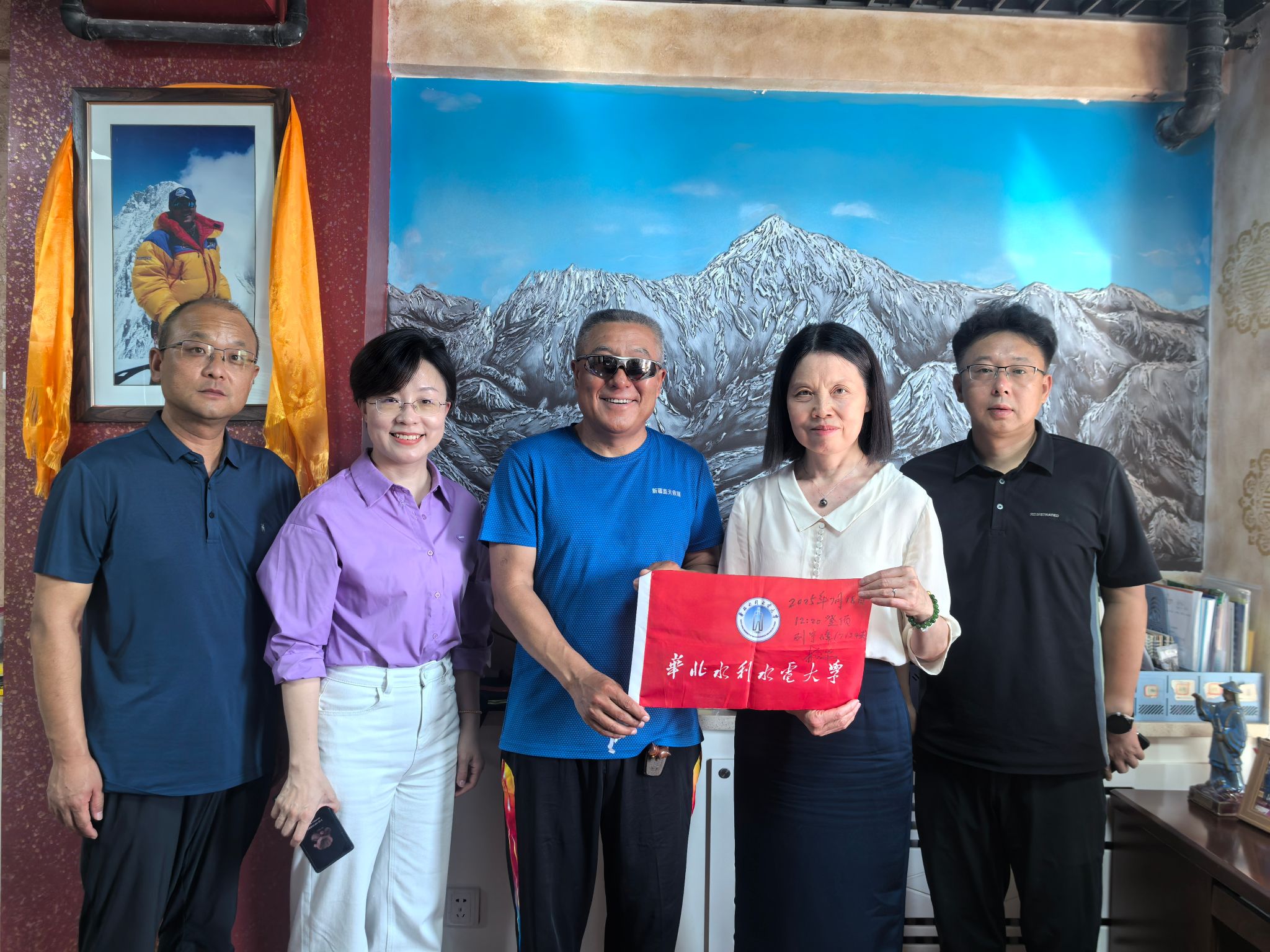 在新疆期间,焦爱萍看望了校友,参加新疆校友座谈会。我校校友、新疆蓝天救援队队长、新疆校友会会长安少华将7月18日成功登顶列宁峰时展示的华北水利水电大学校旗捐赠给母校。焦爱萍表示,多年来,以安少华为代表的一千多名校友扎根西部,辛勤耕耘、成绩斐然,彰显了华水人敢为人先、追求卓越的拼搏精神。希望广大新疆校友抓住国家西部大开发战略机遇,再创佳绩、再立新功,同时也希望新疆校友会能充分发挥桥梁和纽带作用,形成强大合力,推动学校和校友事业共同发展。