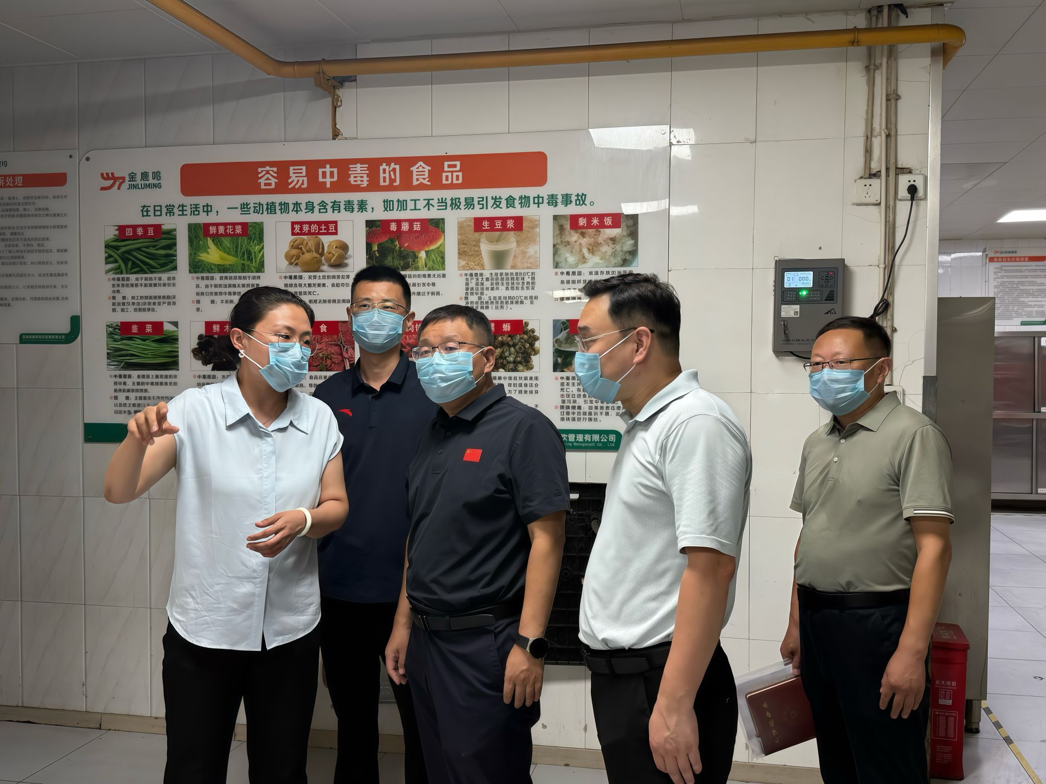 刘俊国一行先后深入龙子湖校区东一、西一学生食堂后厨,通过看现场、听汇报、提问题等方式,全面了解原材料采购溯源、加工制作流程、食品留样规范、从业人员健康管理等环节的风险防范情况,重点查看了原材料验收区、食品仓库存储区、食堂后厨操作区、食品留样区、餐具消毒区等关键区域。