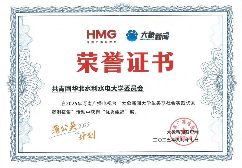 近日,在河南广播电视台大象新闻客户端举办的“大象新闻大学生暑期社会实践优秀案例征集”活动中,华北水利水电大学凭借扎实的实践成效、丰富的成果展示及广泛的社会影响力,荣获“优秀组织奖”。活动期间,学校优秀实践团队风采与成果在大象新闻专栏集中呈现,收获校内外一致好评,品牌传播度与社...