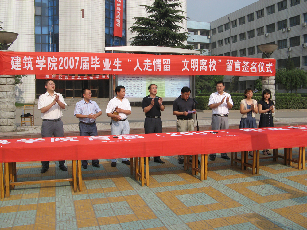 6月12日上午,建筑学院2007届毕业生“人走情留,文明离校”签名仪式在下沉广场隆重举行。建筑学院党政领导及有关部门负责人参加了活动仪式。 张新中院长首先对圆满完成学业即将毕业离校的同学们表...