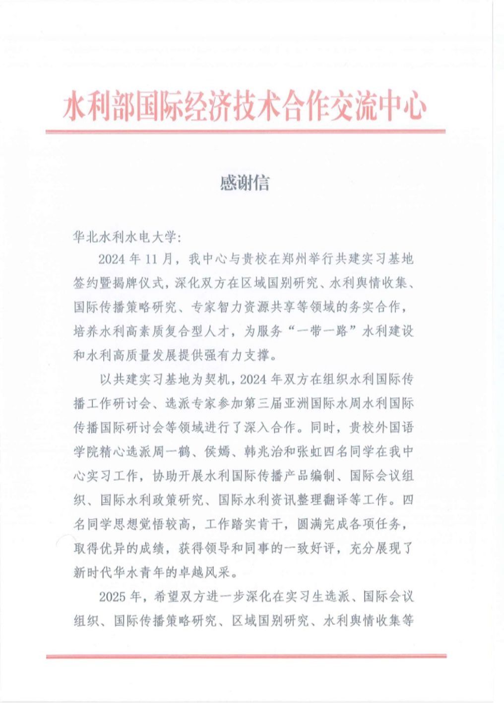水利部国际经济技术合作交流中心向我校发来感谢信