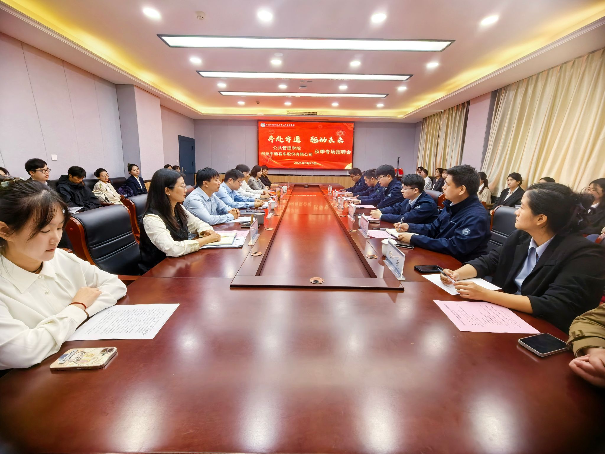 9月26日,郑州宇通客车股份有限公司专场招聘会在我校公共管理学院7217会议室举办。学校纪委书记、监察专员卢新初,郑州宇通集团校园招聘高级经理穆春光、李源等9位企业代表,公共管理学院班子成员及师生代表共同出席会议。专场招聘会由公共管理学院党委书记何芹主持。卢新初代表学校对宇通集团在我...