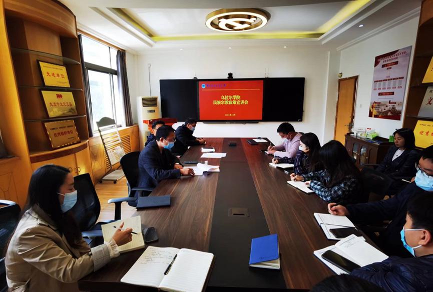 2022年10月9日上午,学院组织召开民族宗教政策法规专题宣讲会。学院党委副书记高郁斌主持会议,学院副院长贾振亮、胡圣能和学院在郑教职工参加会议。