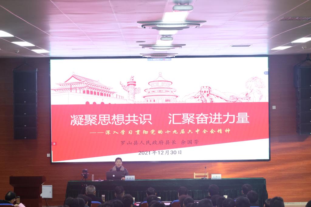 报告共分为五个部分。余国芳围绕党的十九届六中全会精神,结合建设华水江淮校区的重要意义、难忘历程、未来发展等问题展开。第一部分:走深走实,深入贯彻党的十九届六中全会精神。余国芳用简明扼要的数字概括了党的十九届六中全会精神的核心内容,并阐释了应该如何学习和贯彻党的十九届六中全会精神。要搞清楚“中国共产党是什么、要干什么”这一个根本问题,要弄明白“两个确立”的重大历史意义,要厘清马克思主义中国化的“三次飞跃”,要了解中国共产党所经历的“四个历史时期”,要明确中国共产党百年奋斗的“五大历史意义”,还要掌握习近平新时代中国特色社会主义思想“十个明确”和我们党百年奋斗“十条宝贵经验”以及新时代十三个方面历史性成就与历史性变革。学习贯彻六中全会精神要做到五个“必须”,这是我党从伟大斗争、伟大事业、人民中心、伟大工程和接续奋斗角度提出的明确要求。推动学习六中全会精神走深走实,必须坚定理想信念,发挥华水优势,培育时代新人。第二部分:得天独厚,罗山县县情简介。罗山历史悠久、文化灿烂,是革命老区、红色摇篮,资源丰富、美丽富饶,教育雄厚、成就辉煌,南枕大别山,北依淮河水,是物华天宝、人杰地灵的一方热土。第三部分:顺势而为,华水落户大别山。华北水利水电大学与信阳市政府、罗山县政府为贯彻落实习近平总书记“两个更好”殷殷嘱托和省委省政府支持大别山革命老区加快振兴发展若干意见而在信阳市罗山县江淮新区建设“华水江淮校区”,意义重大,是顺应时代发展的具体实践,是革命老区发展的热切期盼,是高校创新发展的迫切需要,必将成为校地合作的典范。第四部分:筑巢引凤,决战起高峰。余国芳结合亲身体会,饱含深情地讲解了江淮校区从无到有的难忘历程。“华水江淮校区”能够在短短的10个月时间内,教学楼、学生宿舍及研究生公寓一应俱全,教学、实验室设施配备齐全,生态水系一步一景,集自然景观和人文景观为一体,如期兑现“交钥匙”承诺,离不开各界人士的关心与支持。尤其是余学群、翁先定等爱心企业家,可敬可爱的老区群众,辛苦付出的建筑工人,建设过程中的服务员、指挥官和核心力量“华水人”,正是这样一群群参与建设华水的人,一位位操心江淮校区发展的华水人,铸就了今天华水江淮校区平地起高楼、呈现绿色、生态、环保的现代化园林式学校的蓬勃生机。第五部分:深化合作,清源善水谱新篇。余国芳指出,华北水利水电大学江淮校区的蓝图已经绘就,省市县各级党委政府领导高度重视,为高标准建好江淮校区、高质量发展江淮校区提供了坚强保证。下一步,将按照华水江淮校区规划,启动二期工程建设,进一步优化广大师生学习、工作、生活环境,打造美丽舒适的新家园。罗山有丰富的水资源、厚重的红色文化、广阔的发展平台,“十四五”时期,罗山县正大力推进“一极四区”新罗山建设,我们将以实际行动贯彻落实党的十九届六中全会精神,牢记领袖嘱托,锚定“两个确保”,加快老区振兴,加速绿色崛起,以实际行动践行“勤奋、严谨、求实、创新”的华水精神,为大别山革命老区振兴发展增添动力,把革命老区建设更好、让老区人民过上更好的生活!