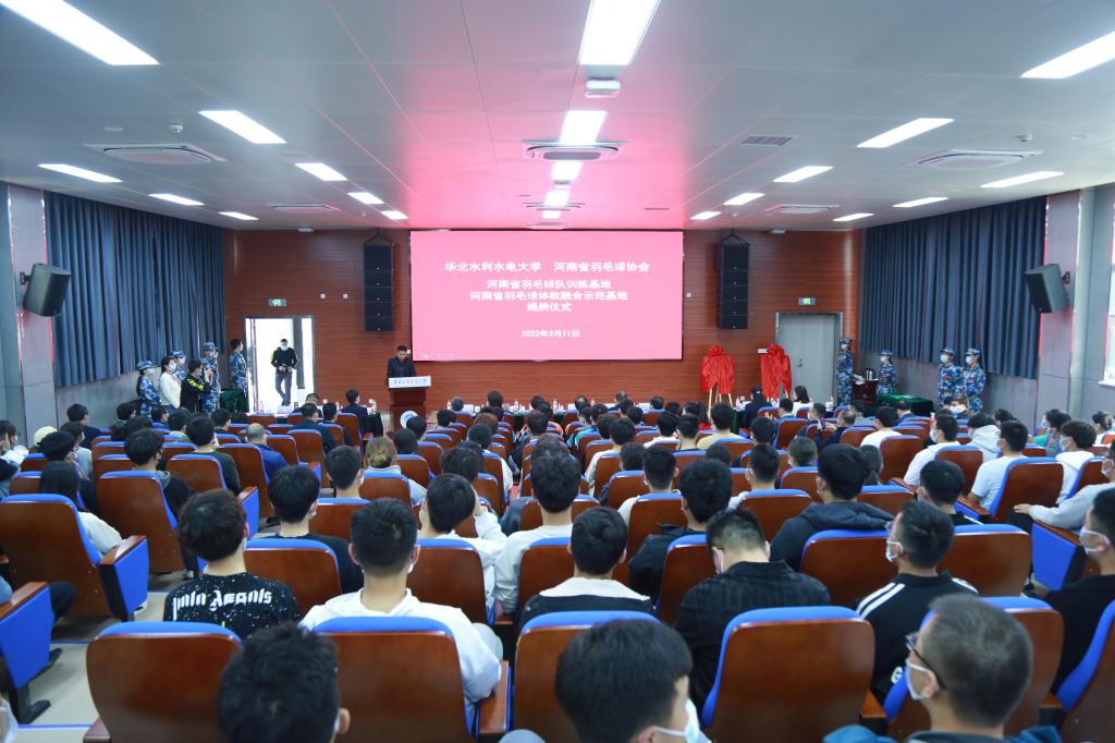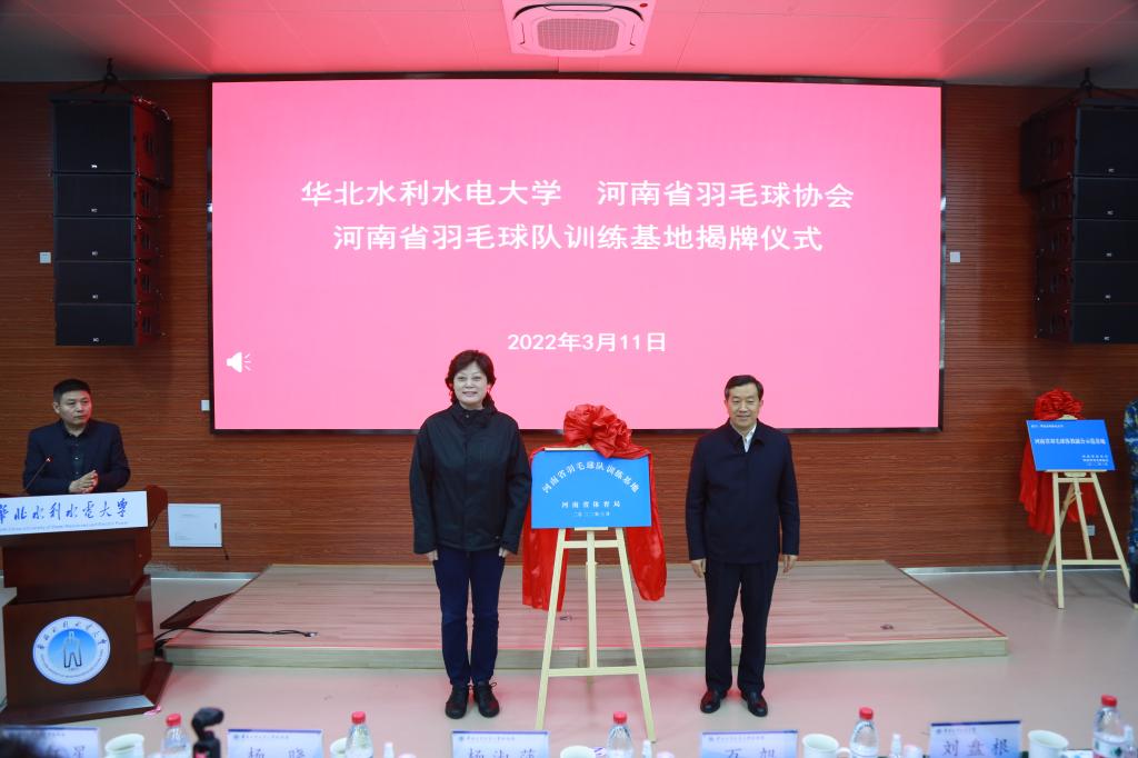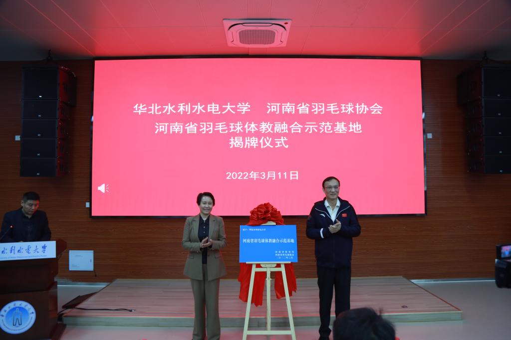 刘盘根、常红星代表华北水利水电大学与河南省羽毛球协会签署“体教融合”战略合作协议。万旭、杨淑萍为河南省羽毛球体教融合示范基地揭牌;杨晓、厉天军为河南省羽毛球队训练基地揭牌。