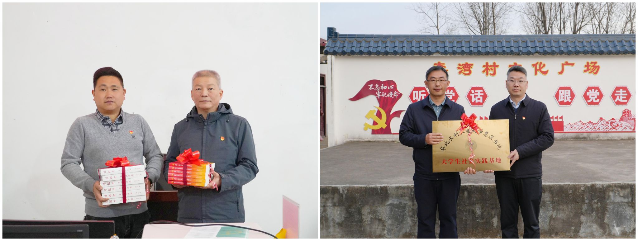 理论学习结束后,书院党委向李湾村党支部赠送《习近平治国理政(第五卷)》等理论书籍。随后,双方举行“华北水利水电大学慧泉书院大学生社会实践基地”揭牌仪式。实践基地的建立是书院落实立德树人根本任务,将学习课堂延伸到田野乡间、加强实践育人的具体行动,是书院与乡村发挥各自优势,共同引导学生走出课堂走向田间地头、广泛开展“接地气”“粘泥土”社会调研与实践活动的重要举措。