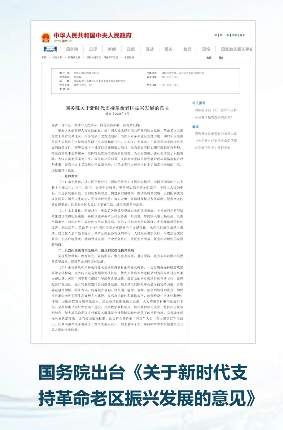 2021年2月20日,国务院出台了《关于新时代支持革命老区振兴发展的意见》(国发〔2021〕3号),提出“支持革命老区重点高校、重点学科和重点实验室建设,加大对口支援革命老区重点高校工作力度,鼓励“双一流”建设高校、中国特色高水平高职学校与革命老区开展合作共建”