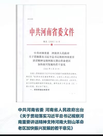 2020年6月5日,河南省委、省政府在信阳市新县召开“河南省大别山革命老区振兴发展工作推进会议”,深入学习贯彻习近平总书记视察河南重要讲话精神,对加快大别山革命老区振兴发展进行再动员、再部署,努力在实现“两个更好”上迈出更大步伐