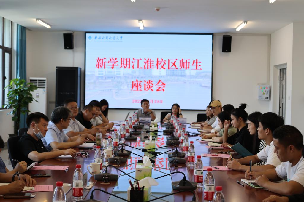 2022年4月20日,校党委书记王清义赴江淮教育基地召开座谈会,代表党委对驻守江淮校区建设一线的全体教职工表示慰问