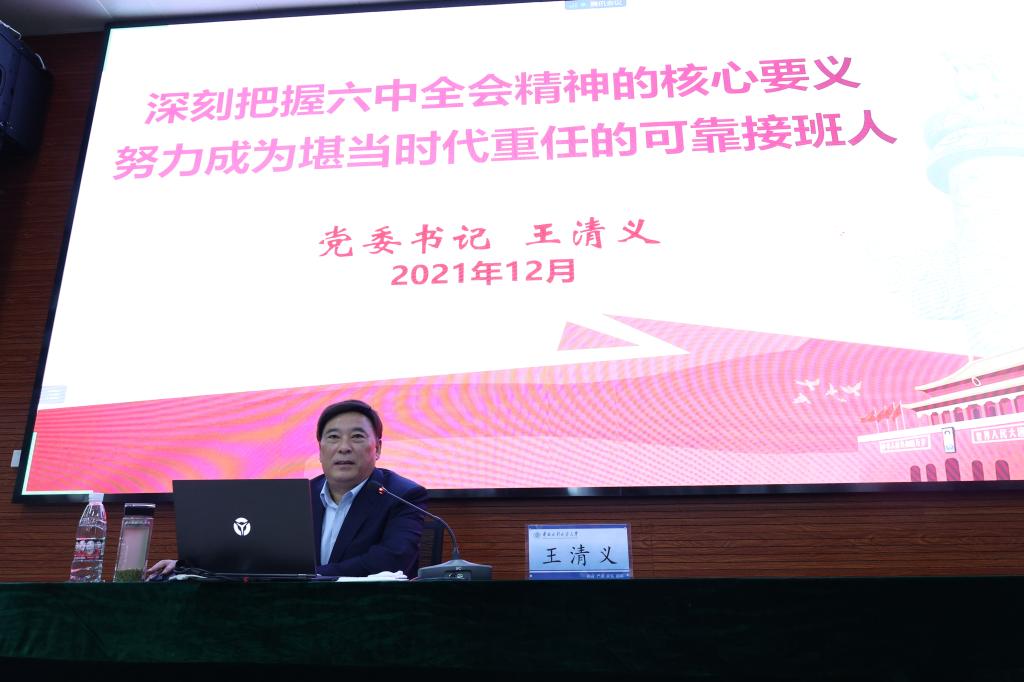 2021年12月25日,校党委书记王清义教授为江淮校区在校师生作题为《深刻把握六中全会精神的核心要义 努力成为堪当时代重任的可靠接班人》专题形势与政策报告