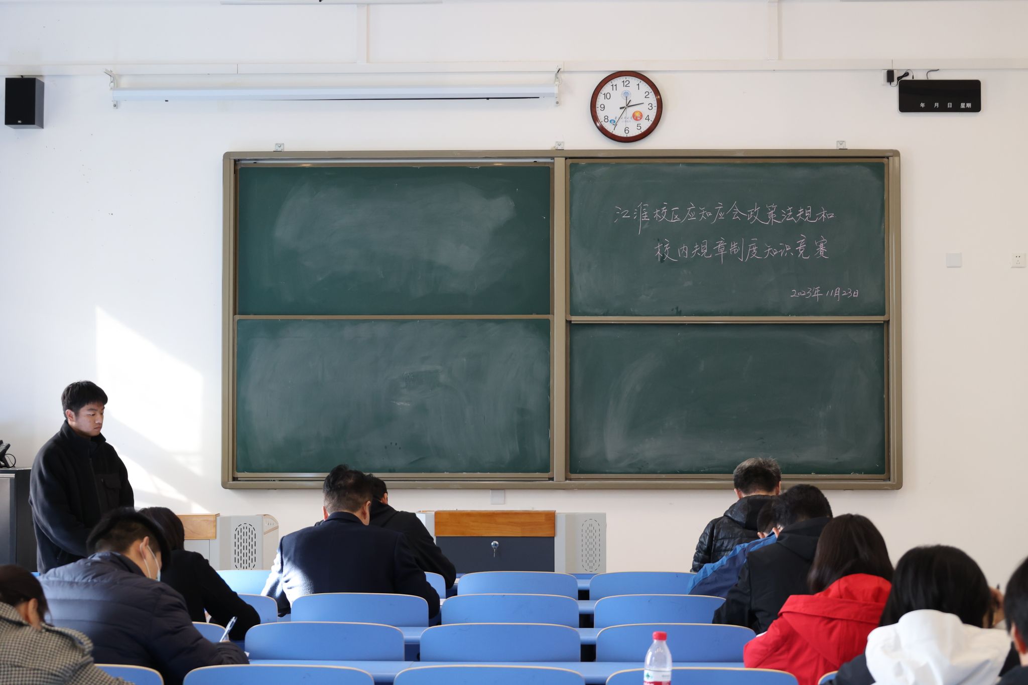 11月23日下午,江淮校区在一号教学楼1105举行应知应会政策法规和校内规章制度知识竞赛暨主题党日活动。江淮校区管理委员会全体干部和各支部党员参加活动。按照学校党委组织部《关于印发中层干部应知应会政策法规和校内规章制度清单》的通知,江淮校区管理委员会党委把《华北水利水电大学中层干部应知应会政策法规和校内规章制度清单》的理论学习贯彻落实到党委理论学习中心组学习、第一议题和“三会一课”当中。进一步提升了江...