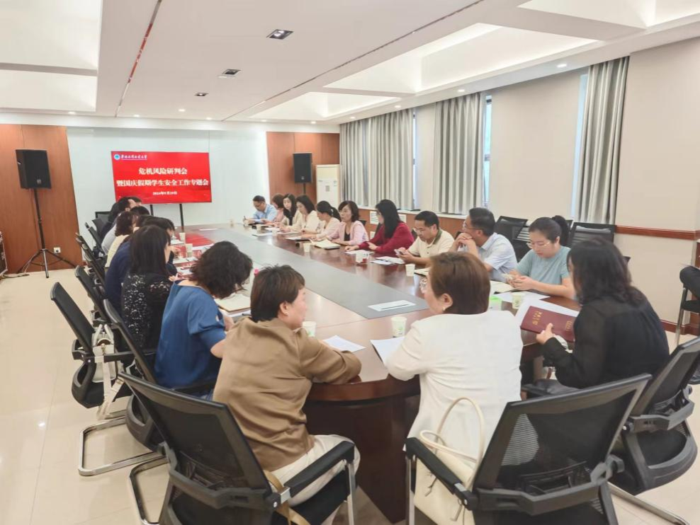 为做好近期心理健康教育工作和国庆假期学生安全工作,9月29日上午,我校在龙子湖校区学生活动中心222会议室召开危机风险研判会暨国庆假期学生安全工作专题会。学生工作处处长郭瑾莉、学生工作处班子成员、各学院党委副书记和学生处相关工作人员参加会议。江淮校区各书院党委副书记线上参加会议。