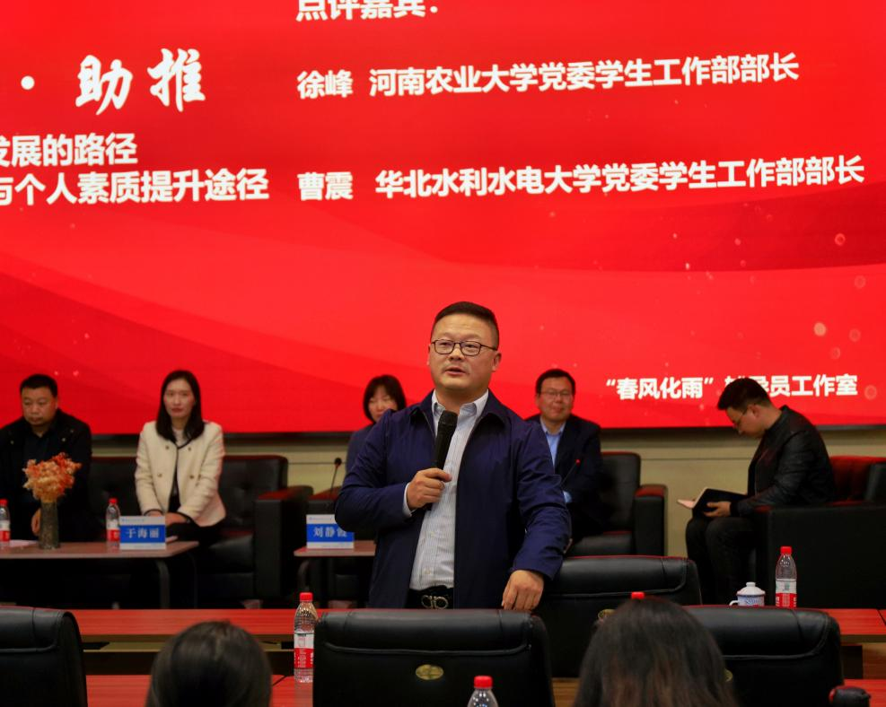 徐峰对嘉宾发言进行了点评,他表示各位的发言思路清晰、要点颇多,具有重要的借鉴意义。他指出激励、助推辅导员发展要从学校领导、平台帮助、个人努力三个方面开展,他分享了河南农业大学辅导员队伍的建设成绩与经验,同时告诉在场学员个人能力提升需要自身拼搏与努力。