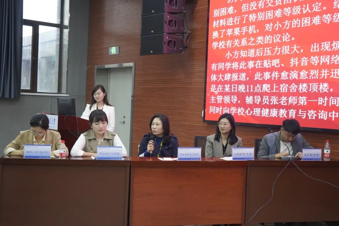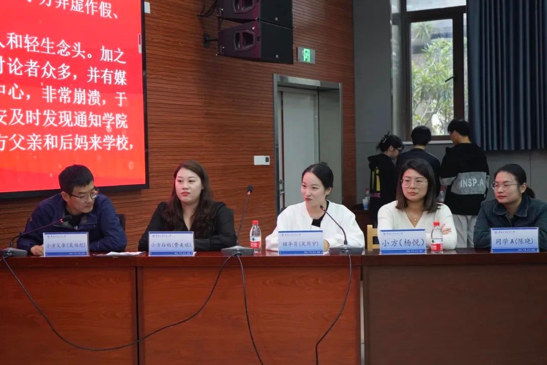 围绕“育人育心,用爱照亮生命”的主题,吴伯彪、费美琪、杨悦、吴芮宇、陈晓、刘洋、齐爽、丁筱萌、申坤、刘贝贝十位老师分别扮演了A组小方父亲、小方后妈、小方、辅导员同学A和B组党委副书记、心理教师、学校领导、媒体人员和同学B的角色。通过具体案例分析和双方两组的充分交流中分析事件痛点,积极寻求解决方案。此案例充分展现出在学生日常工作中面对心理问题导致的危机事件干预中如何以扎实的理论基础和丰富的实践经验积极应对的过程。