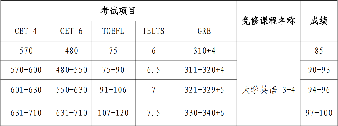 4.参加全国大学外语四六级考试和国外英语水平考试(TOEFL、IELTS、GRE 等),考试成绩达到一定条件的学生可申请免修大学外语课程。