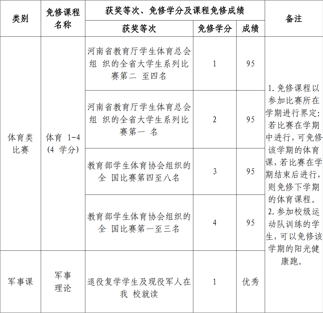 6.参加本学期运动队的正常训练,可免修“校园跑”;参加教育部学生体育协会组织的全国比赛、河南省教育厅学生体育总会组织的全省大学生系列比赛获奖者可申请免修体育类课程。