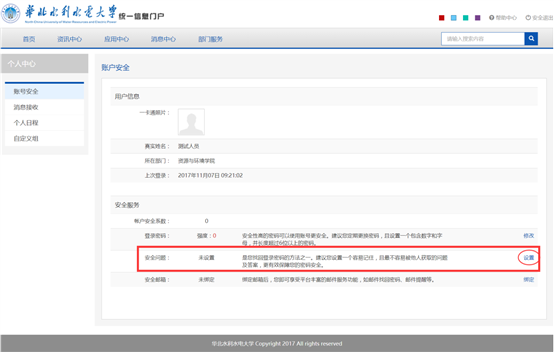 在个人中心页面,选择设置安全问题,如图: