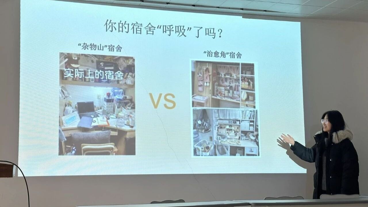 活动开场,王雅雯依托自己准备的科普PPT,向大家介绍了宿舍收纳的基础常识:通过图文对照区分不同类型物品的收纳需求,用真实宿舍案例解释空间规划不合理、收纳工具使用不当引发的杂乱问题,借助通俗的语言让在场同学快速了解宿舍收纳的常见痛点与解决思路。