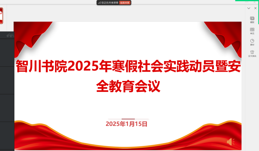 为深入学习习近平新时代中国特色社会主义思想,全面贯彻落实党的二十大和二十届三中全会精神,提高师生参加基层社会实践与志愿服务活动的安全意识,1月15日,智川书院召开线上2025年寒假社会实践安全教...