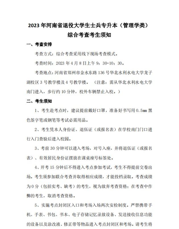 2023年河南省退役大学生士兵专升本(管理学类) 综合考查考生须知