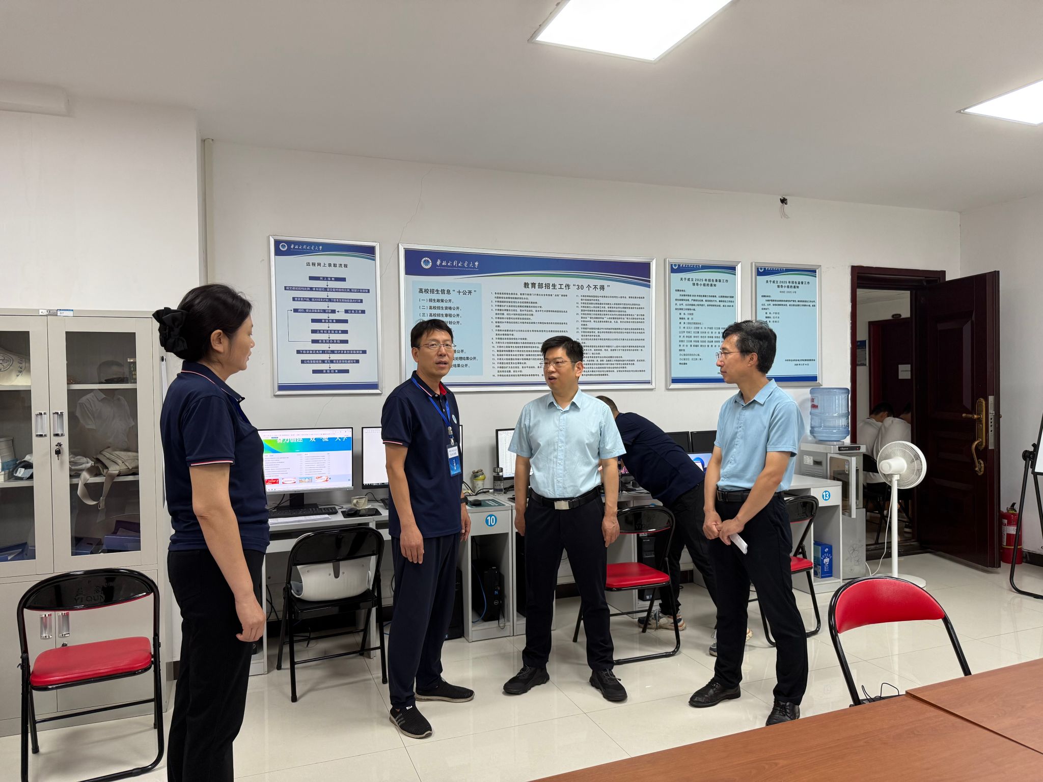 党委办公室、校纪委、党委学工部、校长办公室、就业指导中心、校工会等职能部门负责人陪同检查,并与招生工作人员进行了深入交流。