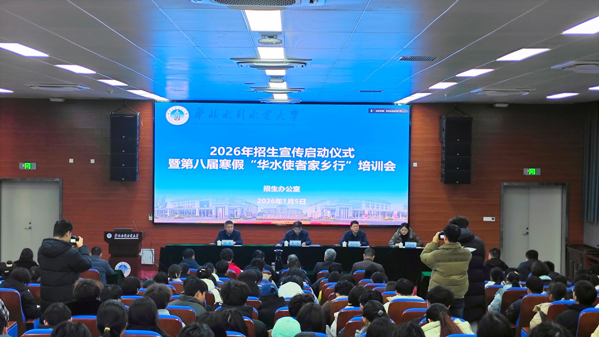 为扎实推进2026年招生宣传工作,凝聚招生工作合力,1月5日,学校2026年招生宣传启动仪式暨第八届寒假“华水使者家乡行”培训会议在江淮校区第一报告厅、第四报告厅分时段有序召开。副校长姜彤出席会议并讲话。